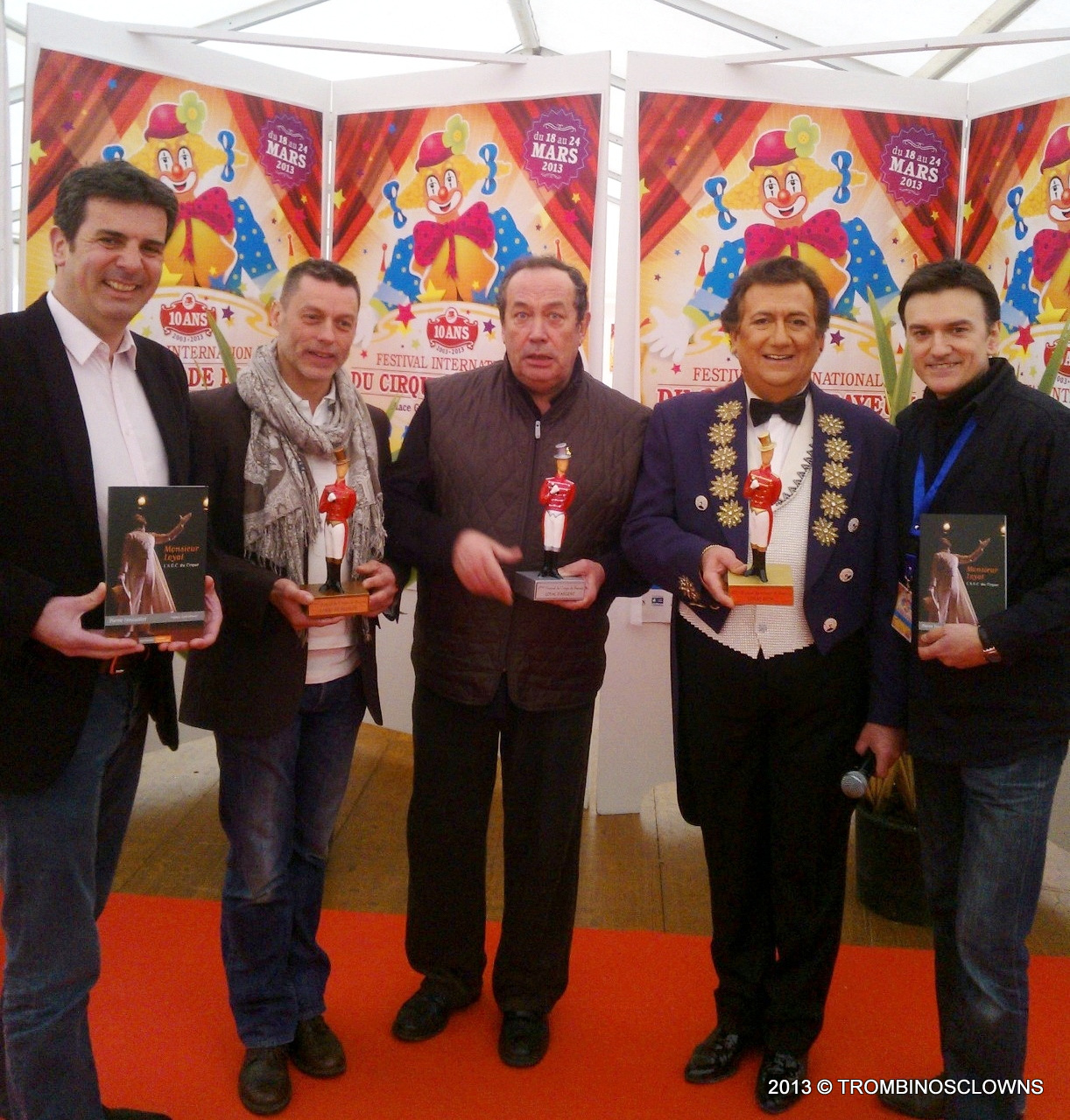 De gauche à droite : Frédéric Colnot, Patrice Roche, Sergio, Christophe Ivanés et Thierry Planés , créateur du trophée Monsieur Loyal pour le festival